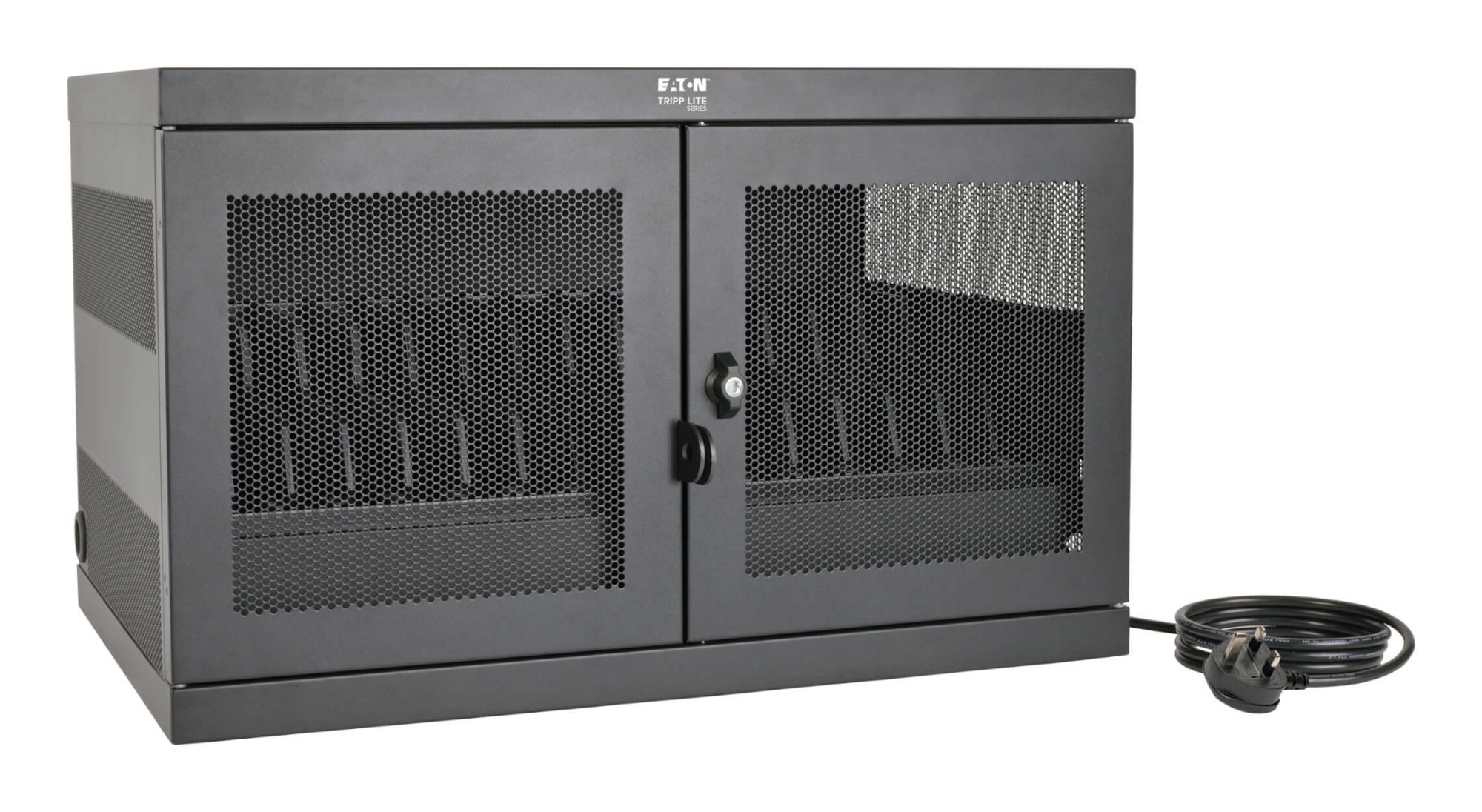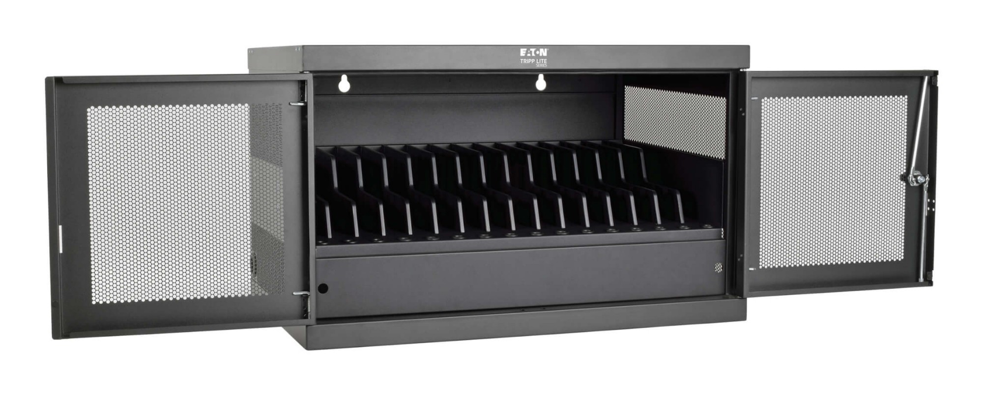 The CSCXB16USB ships fully assembled for quick installation on a desktop or floor in a structurally sound area or wall mounting with user-supplied tools and hardware. You can also convert it to a mobile cart with the optional CSHANDLEKIT2 (sold separately), and roll it where needed. The split front doors open 180 degrees for improved device and service access. You can remove the shelf dividers to fit thicker devices, such as battery chargers, and a firmware upgrade port allows future updates.