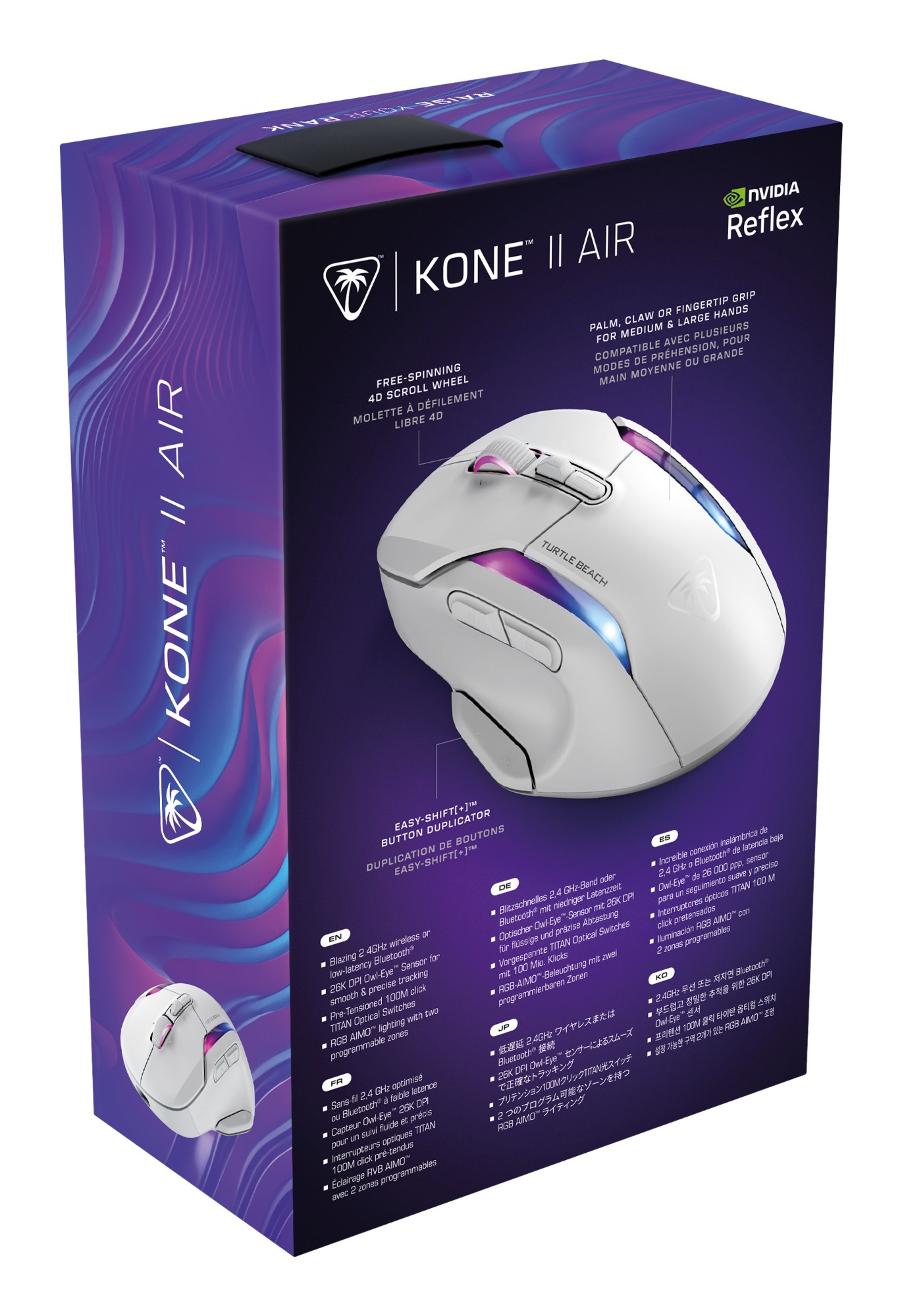 Raise Your Rank with the Turtle Beach® Kone™ II Air wireless ergonomic gaming mouse. Play uninterrupted for weeks with up to 350-hour battery life via Bluetooth® or up to 130 hours with 2.4GHz wireless. Crafted for medium to larger hands, Kone accommodates all grips. Command your gameplay with 21 customizable functions, including Easy-Shift [+]™ technology. Glide seamlessly with the multi-function 4D free-spin scroll wheel and click satisfyingly with TITAN Optical Switches. Track with precision using the 26K/650 IPS optical sensor and enjoy smooth movements with pure, heat-treated PTFE glides. Customize dual-zone AIMO™ RGB illumination. Charge effortlessly with the ultra-flexible PhantomFlex™ cable and enjoy NVIDIA® Reflex compatibility for enhanced gaming precision.