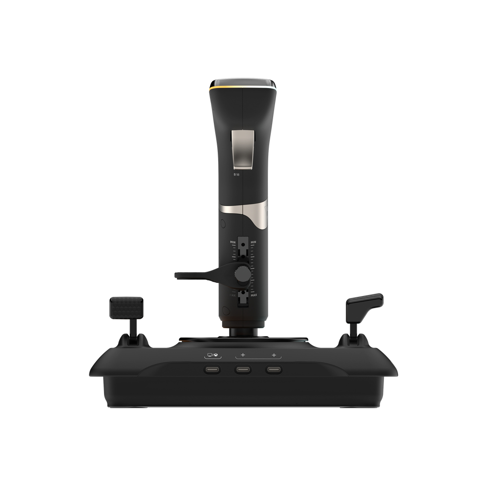 The Turtle Beach® VelocityOne™ Flightstick for Xbox Series X|S, Xbox One & Windows 10 & 11 PCs equips you with immersive, accurate controls for navigating air and space flight simulation & combat games on Xbox and PC. High resolution non-contact sensors provide precise response and extended longevity to the main stick controls, while throttle and flap levers control main engine power and make for quick adjustment of secondary control surfaces. Plus, the levers can be customized with swappable throttle heads to suit the aircraft you are flying. Precision detents at the minimum and maximum positions allow activation of full reverse thrust at minimum, and afterburner, boost or Take Off/Go Around thrust at maximum. An ultra-precise nano trim wheel allows for fine tuning of attitude, and an analog POV hat allows freelook in cockpit views or strafe thrusters in space simulation games. An OLED Flight Management Display makes for easy adjustments to control profiles, trim wheel input mode, rudder lock and more. Navigate the FMD using an intuitive rotary dial with click at the base of the stick to configure, and update product performance in real-time with all information stored in on-board memory. 27 programmable buttons, including an 8-way digital POV hat, rapid fire trigger, stick mounted buttons, dual throttle lever detents and 8 programmable base buttons equip you with an arsenal of adjustable controls to your most critical simulation functions. Pilot fighter jets or airliners thanks to an ambidextrous right and left-handed design with a reversible wrist rest, and programmable base buttons allow the entire setup to be configured for right, or left-handed controls. Take customization a step further and adjust the color, brightness and response of multiple RGB LED zones. Familiar Xbox controls allow for easy console operation, and you can switch input mode to PC to play across a wide range of simulation titles. Plus, the Flightstick can be used alongside the Turtle Beach VelocityOne Rudder Pedals on PC and Xbox*, for an even more immersive flight experience.
