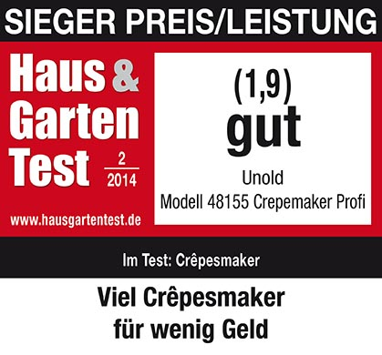 With the CRÊPE MAKER Pro, perfect wafer-thin crêpes are ready in no time at all. Batter is distributed on its extra-large, die-cast aluminium plate with a high-quality non-stick coating (33 cm diameter), the crêpe is browned on one side and then turned (flipped). That's it! Via the indicator light and the variably adjustable temperature regulator, the CRÊPE MAKER Pro shows when the perfect operating temperature has been reached. In addition to the detachable power cord, the CRÊPE MAKER Pro includes a batter distributor and a wooden spatula. And to top it off, the operating instructions include delicious recipes.