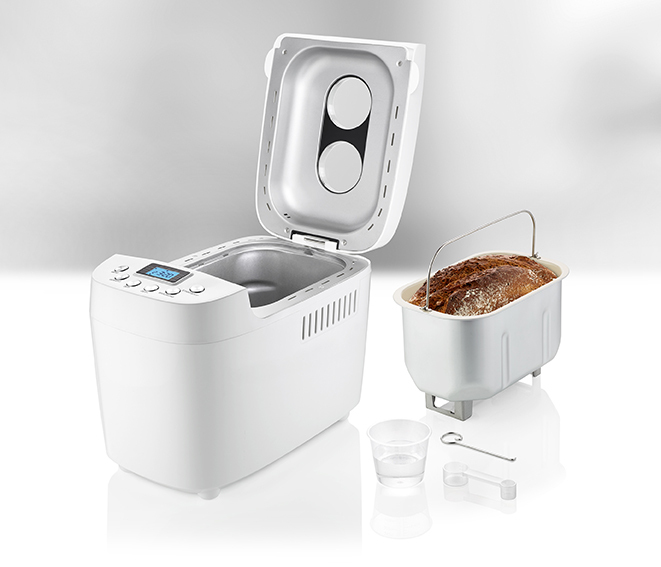 The BPA-free BACKMEISTER ® Big White offers 15 saved programs for bread (also gluten-free), jam, cake, pasta dough or yoghurt. With the powerful, robust AC motor, among other things, 3 bread sizes and 3 degrees of browning can be made and selected – for the removable baking pan and the double kneader (both with ceramic non-stick coating). Safely standing on non-slip feet, can be pre-programmed for up to 15 hours and with lots of accessories: measuring cup and spoon, 2 kneaders, 1 hooked skewer, removable baking mold and operating instructions with recipes.