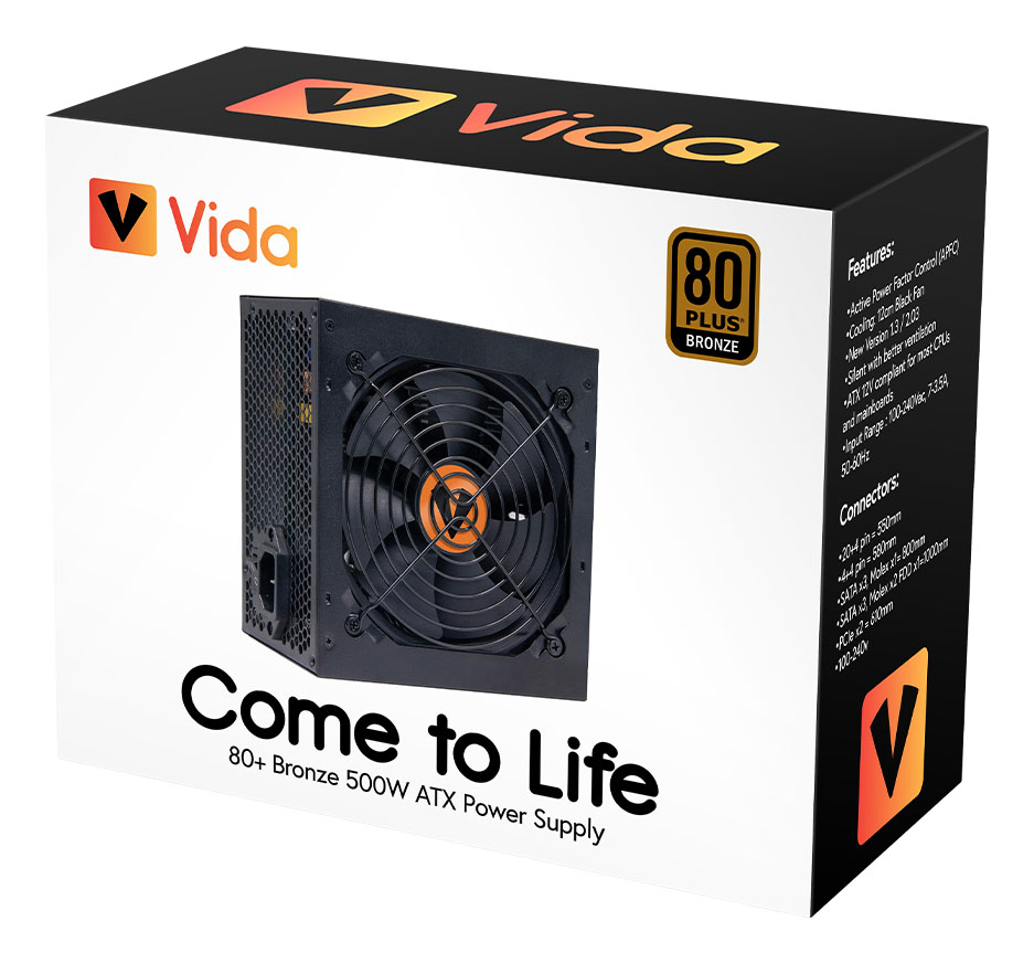 Elevate your PC's performance with the Vida 500W power supply (ATX-500W). Designed for ATX 12V compatibility, this fully wired unit delivers 500 watts of reliable power. Equipped with essential connectors, including SATA and PCIe, and boasting an ultra-quiet 120mm black fan with fluid/hydraulic bearing, it ensures efficient cooling and stable performance. With an 80+ Bronze certification, the Vida 500W power supply strikes the perfect balance between power efficiency and reliability, all backed by a 1-year warranty for your peace of mind.