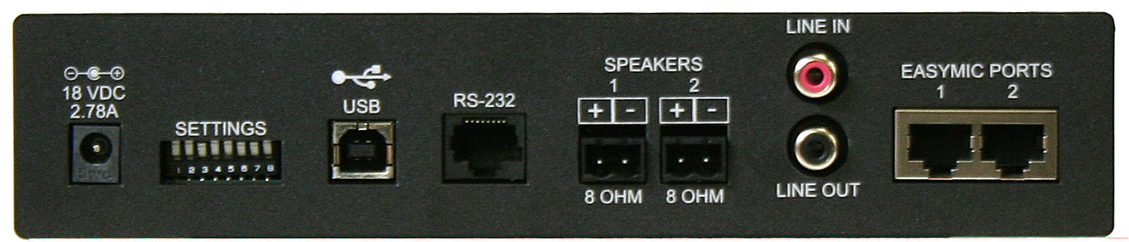 - Supports up to two EasyMic Devices (MicPOD or Ceiling MicPOD) using RJ-45 & Cat. 5 for audio, control, and power (100 feet)