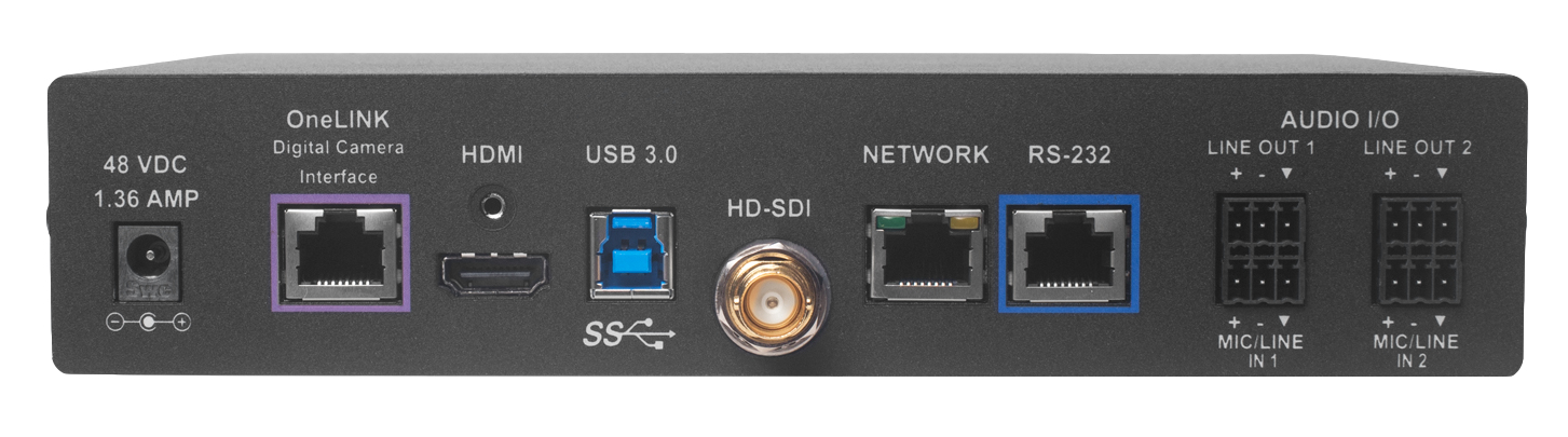 OneLINK Bridge uses HDBaseT technology to extend power, control and video from RoboSHOT cameras, third party PTZ cameras, and compatible HDBaseT A/V switchers up to 100 meters (328 ft) over a single HDBaseT Cat-5e/6 cable. It includes HDMI and HD-SDI outputs, two mic line inputs with echo cancellation, two line outputs, and associated digital audio channels. It also provides a composite USB stream with 1080p/60 video and stereo 48kHz audio to ensure optimal quality of content.