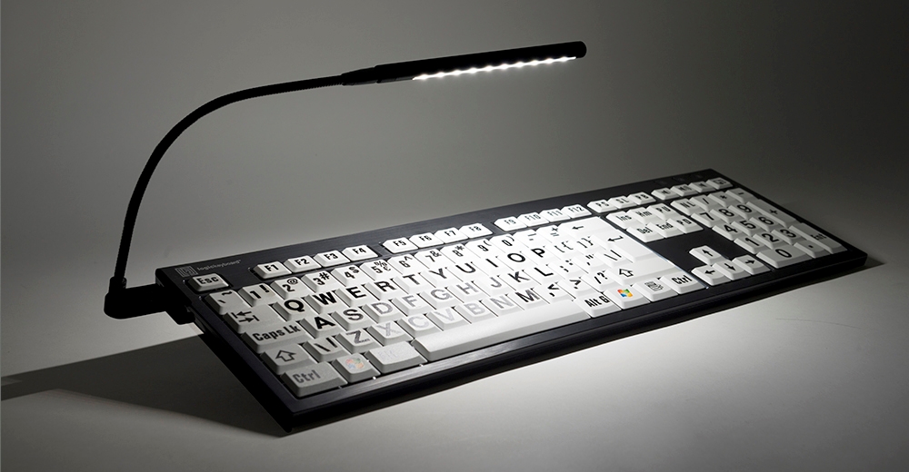 VT Keys 2 Large print keyboard; black letters on white keys; USB. Includes flexible LED lighting strip to further enhance contrast.